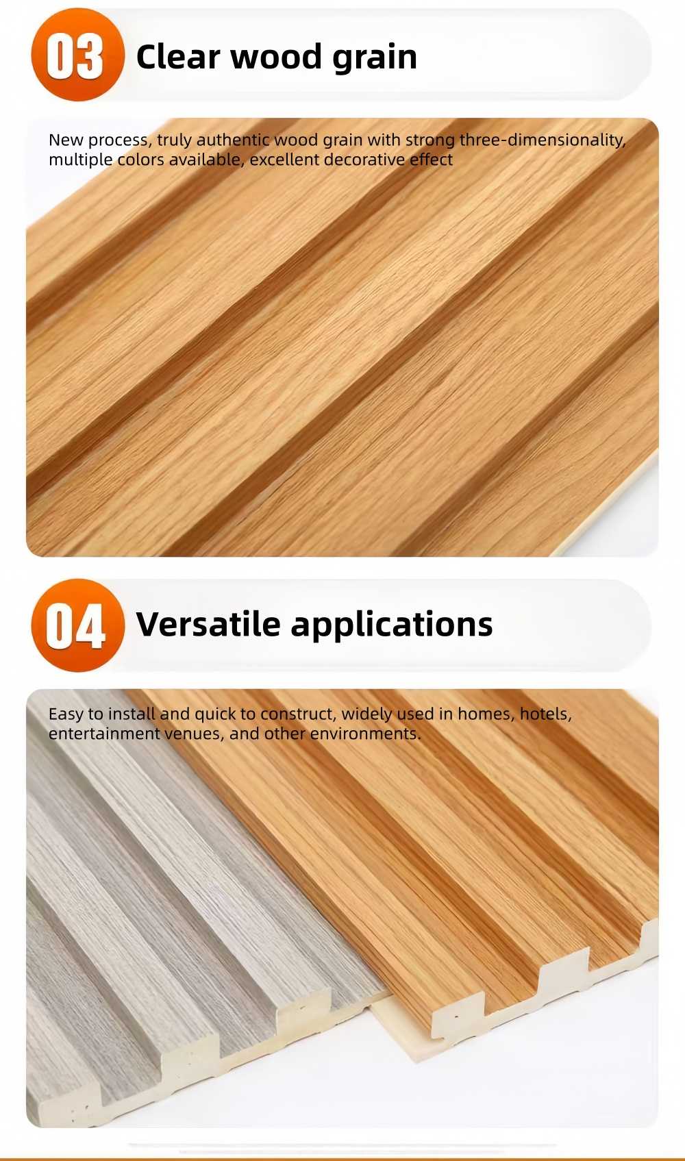 Our solid WPC grid wall panels are made of high-performance wood-plastic composite material. The solid structure ensures excellent impact resistance and durability. The realistic wood grain surface combined with the regular grid lines brings a design aesthetic that blends nature and order to the interior space.