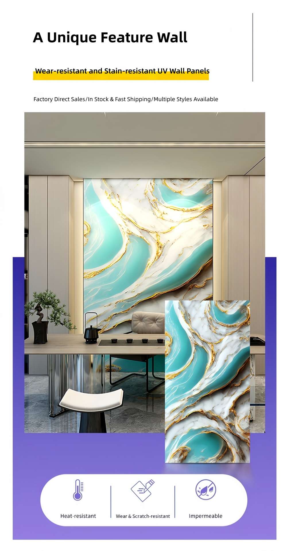 ·Mirror-like high gloss, realistic texture:The UV coating delivers a high gloss of over 90°, with clear and three-dimensional textures, comparable to the luxurious visual effect of natural marble, enhancing the overall ambiance.